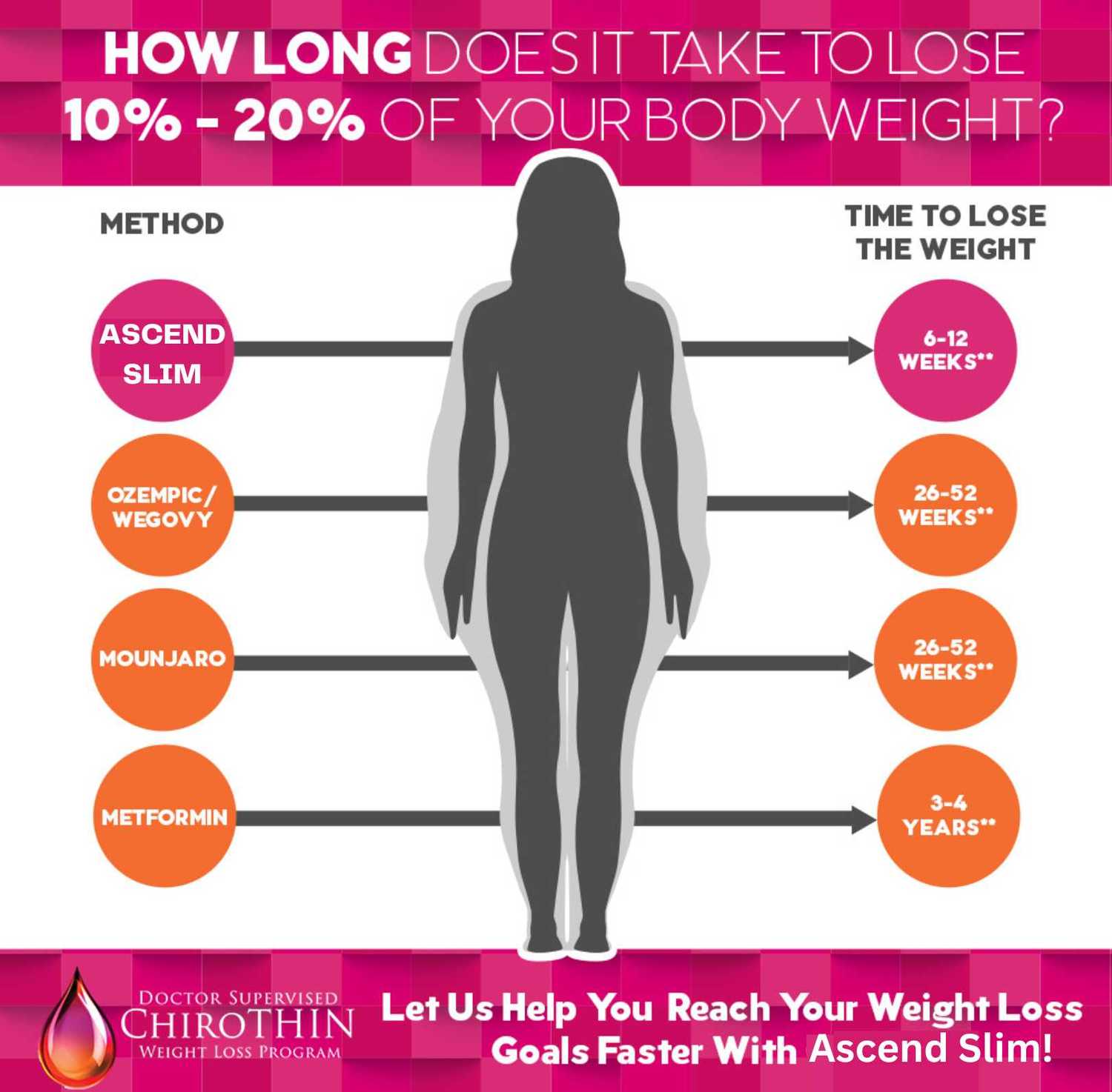 We know it may be hard to believe, but many Ascend Slim patients lose this much weight in 6 weeks. Are you looking to lose weight fast? It doesn’t matter if you’re male or female, in your 20s or 70s. Some people lose more; some people lose less. But here’s the fact: As long as you follow the program, you will definitely lose a lot of weight on this regimen without excessive exercise, stabbing yourself with injections, drinking shakes or eating expensive prepackaged food.
